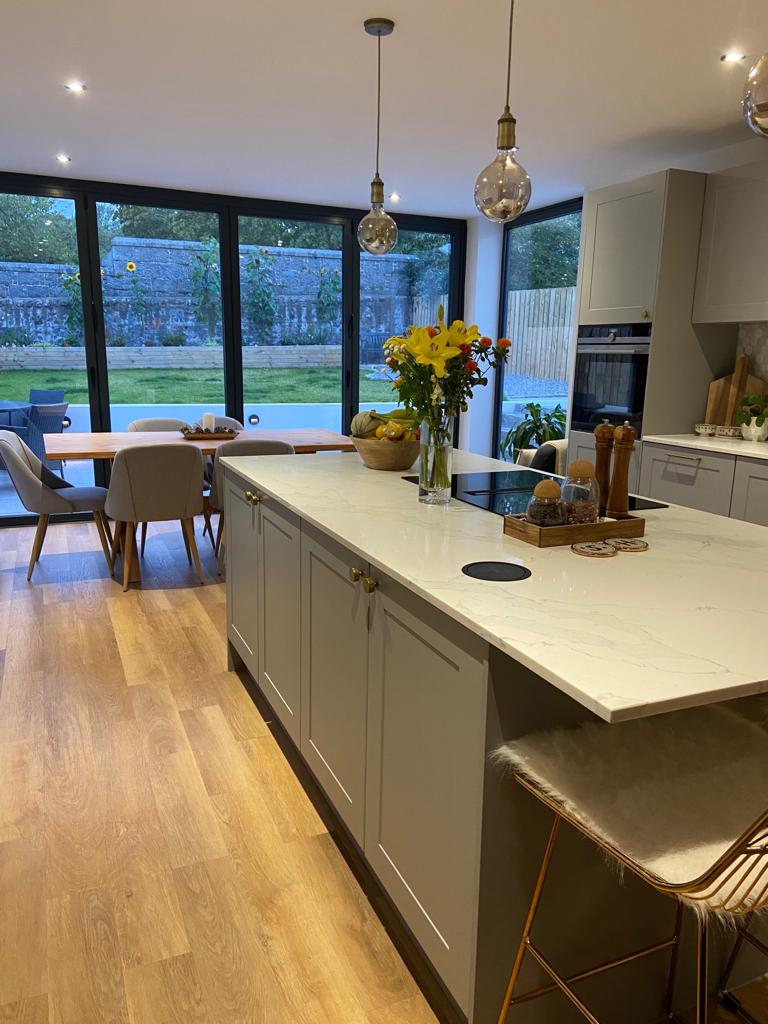 which started on site on 7th June will see the rear of the property and garden area become the main living area and focus the family home. Opening up the rear elevation allows for the creating of an open plan living, dining family room which has views out over the secluded south west facing garden area. The use of a limited pallete of high quality external materials will integrate the extension with the newly formed external terrace. Re-using granite from the down takings was key to allowing the newly formed external terrace to integrate with the new extension. When the new bi-fold doors are open it allows the extension to blend seamlessly with the lower terrace area creating additional space entertaining day or night.